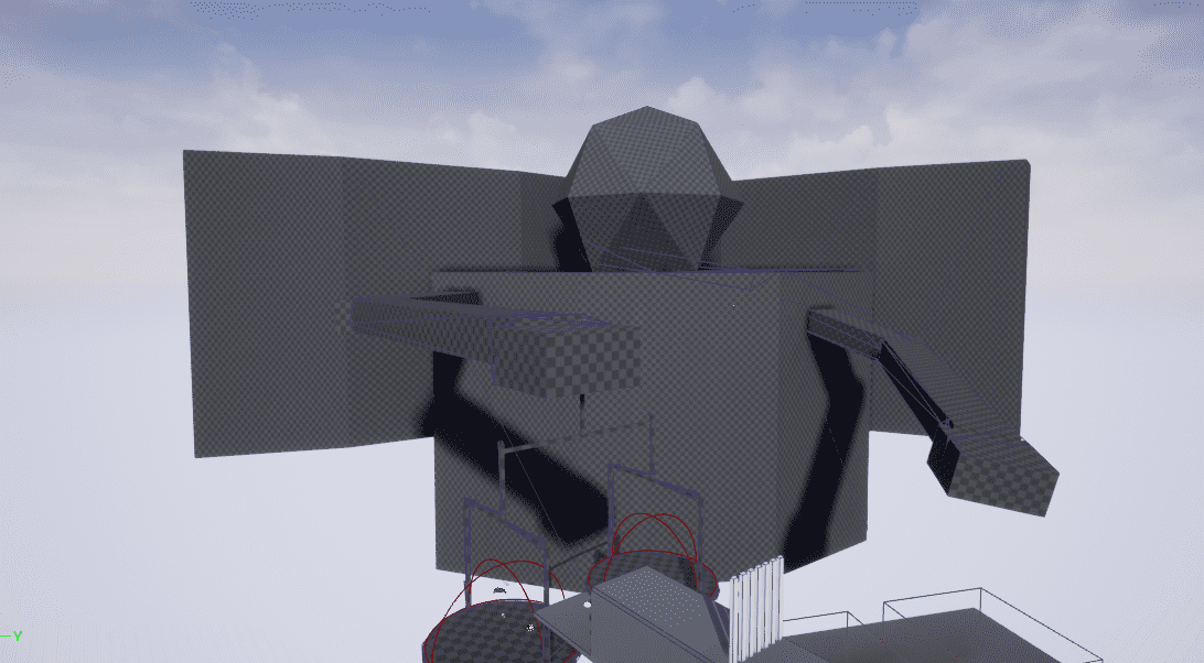 The prototype started with a simple whitebox version of the boss with some of its key features - the wings and the scale. I took some free assets from the Unreal Engine Marketplace. The assets used are from the Paragon game, which after its cancellation had all assets released to the public for free use in the Unreal Engine. I was only able to use a model for the playable character. When I tried to replace the whitebox enemy model with another one it proved quite difficult with my limited knowledge and would have taken too much time. Instead, I focused on polishing the player experience through the fight.