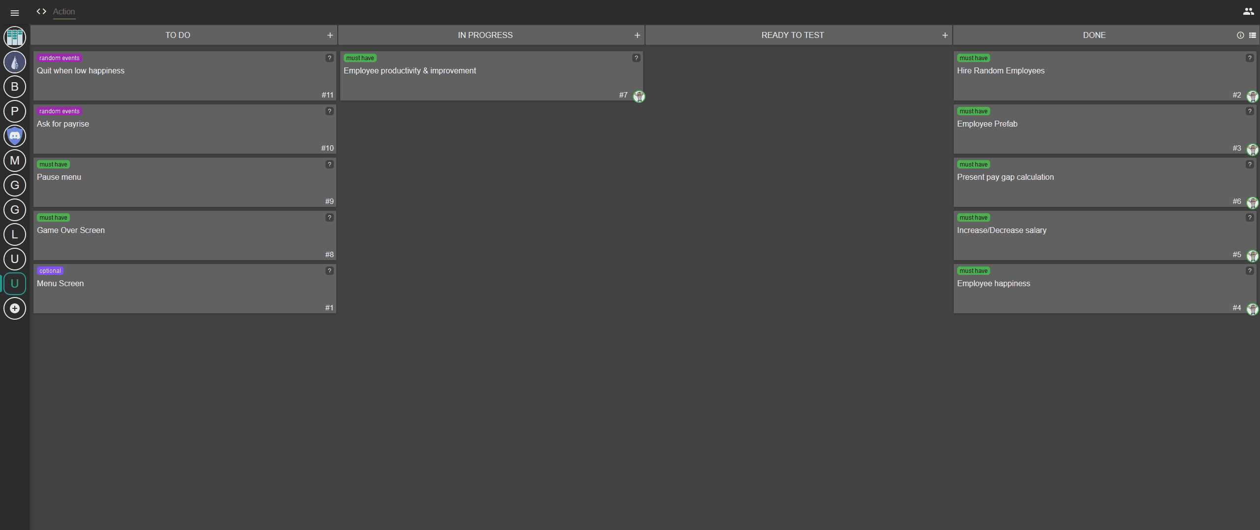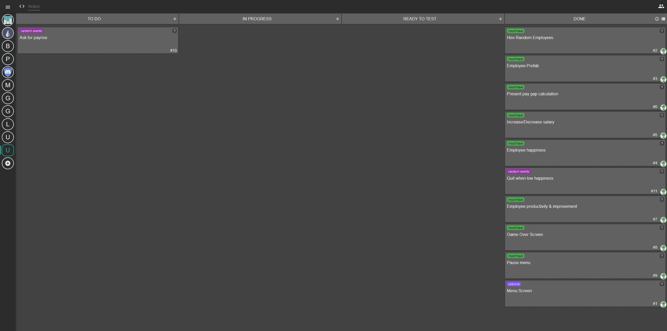 During the second week, I implemented the rest of the basic functionality and added the main menu. Before the end of the Rapid Ideation Session, I had the time to implement one of the tickets I had in the "Random events" category. I added the ability for unhappy employees to leave the company, which incentivises the player to maintain high happiness. This feature in combination with the increasing effectiveness of the long-serving employees creates a solid base for additional mechanics to be implemented in the future.
