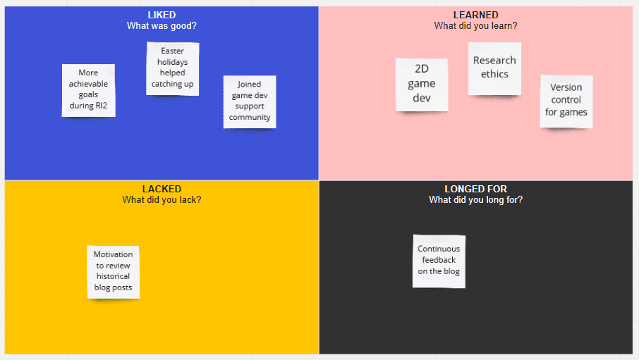 This time I opted for the Four Ls retrospective format. After five minutes I had some notes in each category.