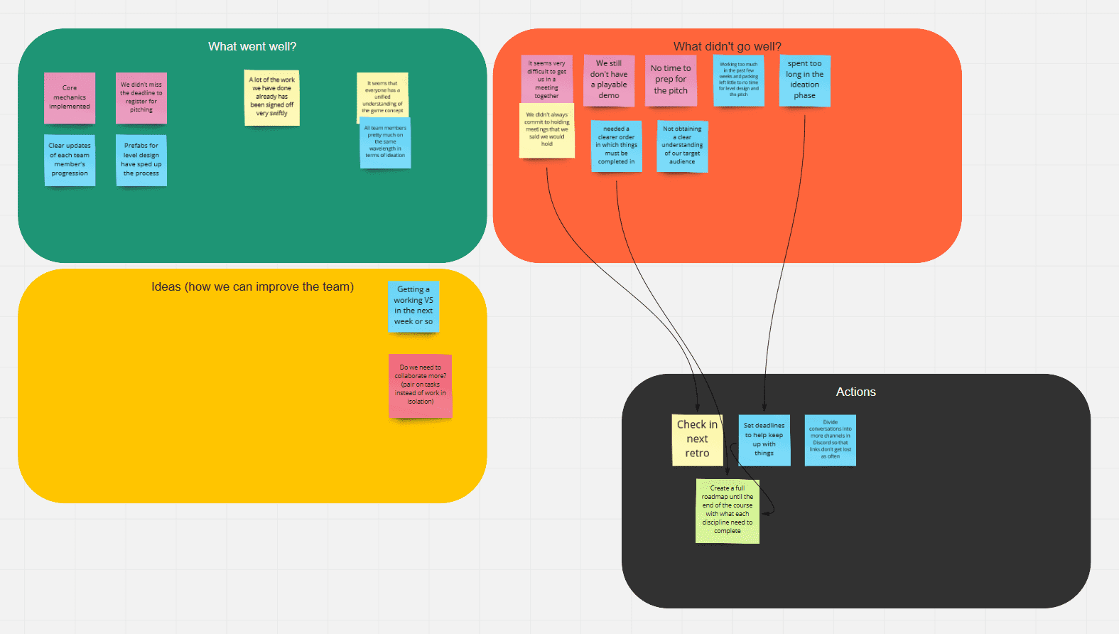 We've been busy. The team started slowly in the first 2 weeks of the course and picked up pace afterwards. Unfortunately, this meant we've been exclusively focused on gaining momentum with the prototype. We've missed all retrospective sessions we were planning to have until now. I've decided it isn't okay to wait for next week when we are supposed to have a scheduled one and added it to the agenda for the weekly Sunday meeting.
