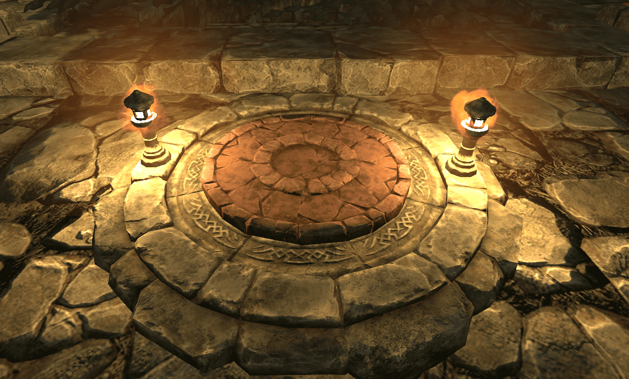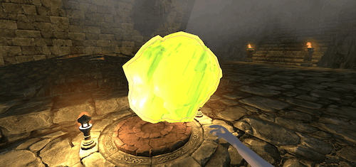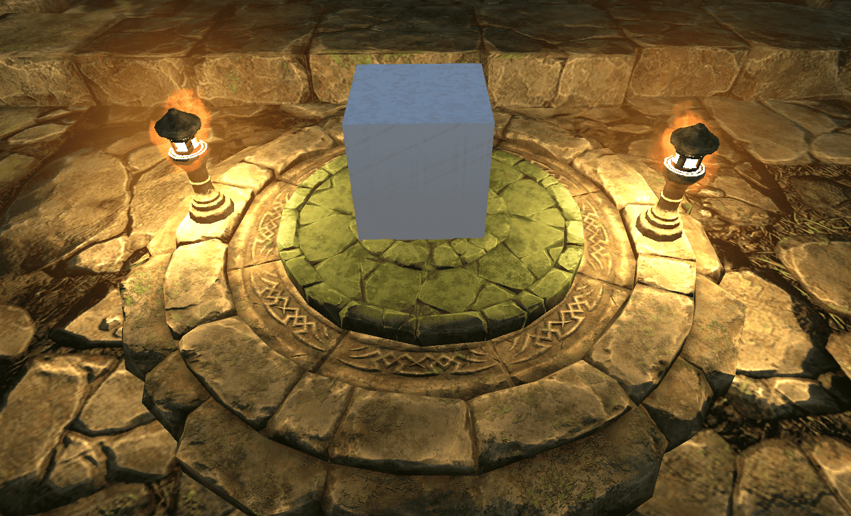 Additionally, our button had "debug colours" enabled. When pressed and released the button was changing colours so that it is clear what the code understands. I found that to be very useful and thought we can keep it as a permanent feature at least until a designer tells us otherwise. However, I changed the colours to fit more the environment and I think they look awesome! On top of that, I added a couple of lanterns next to the button to help navigate the player.