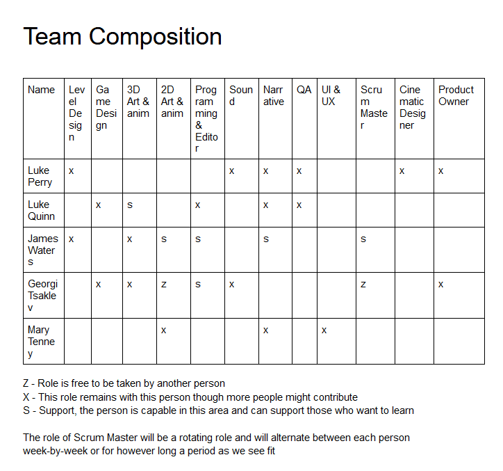 During this second week of the project, we finalised the team organisation. I ensured that we have at least 2 people in each category where possible. This was to ensure we don't have bottlenecks during the development of the game as we are a small, distributed team working in a part-time capacity.