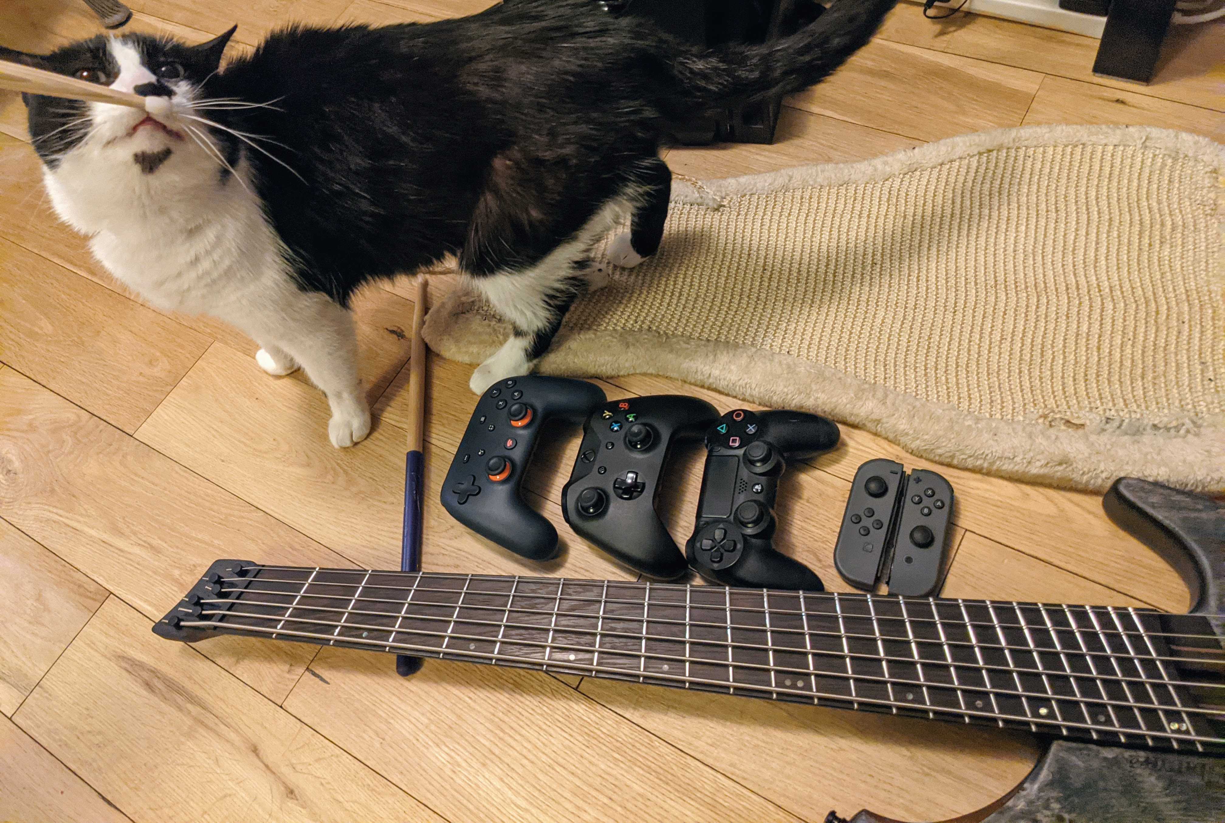 A lot of people have posted their drumsticks so I decided to join in on the fun! I've been a drummer for quite a while before I moved to Glasgow but decided to pick up the bass when I didn't have space in my university accommodation. Naturally, I had to include all of the controllers (one of each) as I enjoy gaming so much. And of course, this is Oreo doing a sniff-by 😄