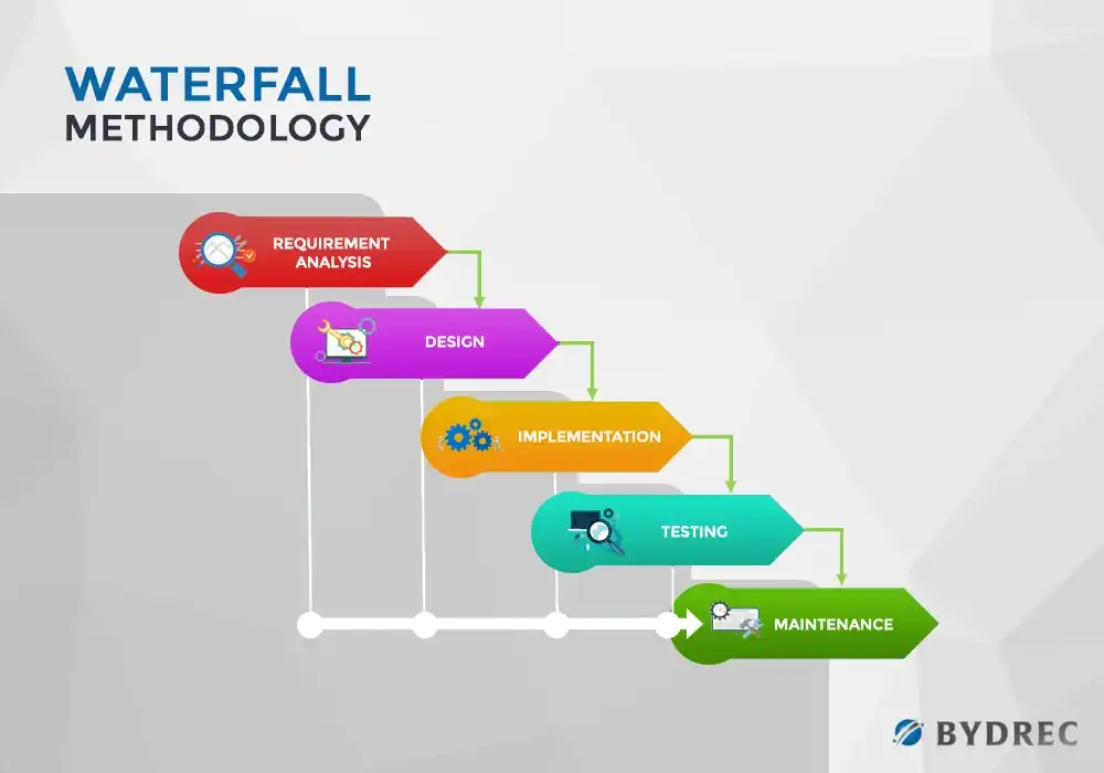 The Waterfall development model takes its name from its structure. The model is fully linear which is both its strength and its weakness. While it provides a lot of structure it lacks support for reflection and incremental improvement, which is so prevalent in development nowadays.